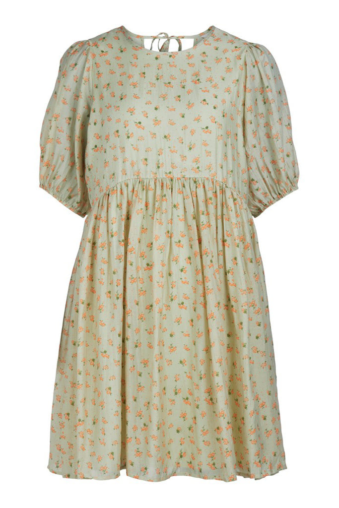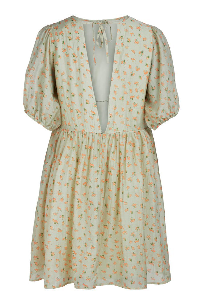 Smuk grøn blomster printet kjole med korte ærmer og åben ryg.