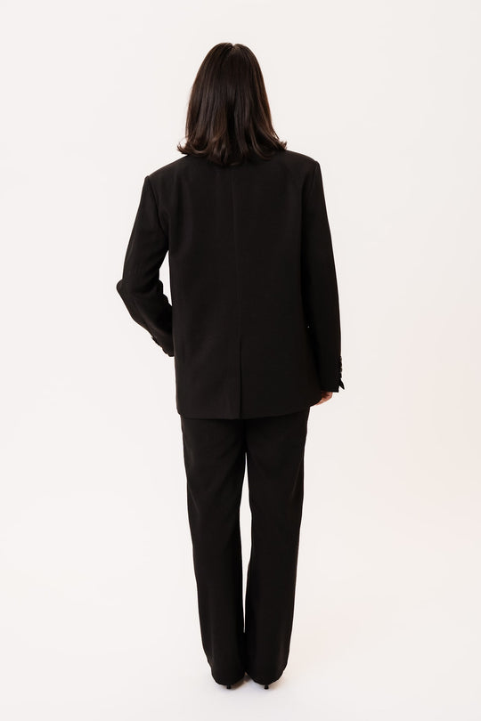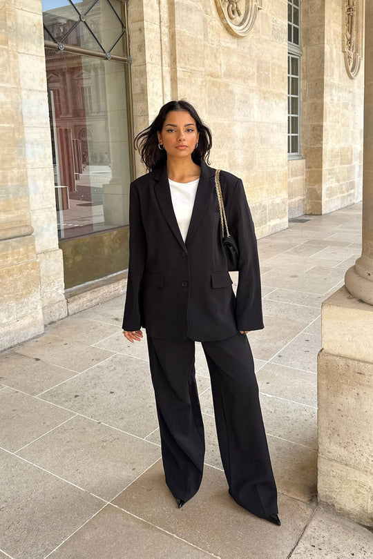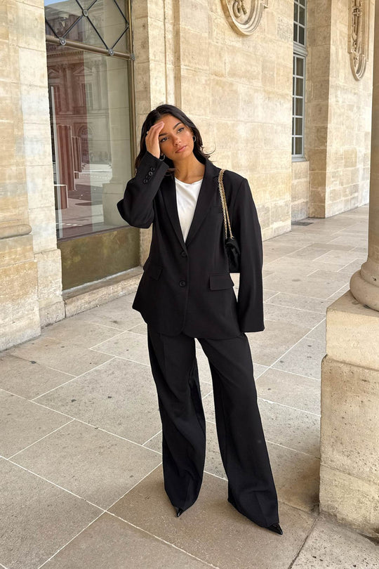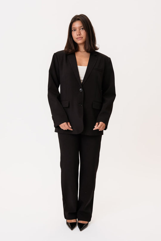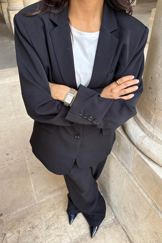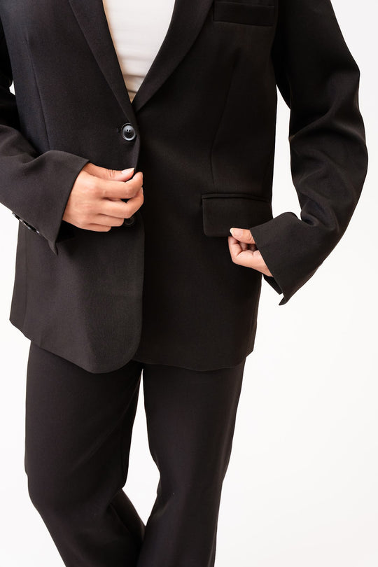 Sort blazer i et smukt stof. Den har en lige pasform og lige ærmer med knapdetaljer ved ærmerne. Der er en lomme på venstre bryst, to forlommer nederst og en skjortekrave, der går i et V foran, hvor to knapper lukkes. En slids bagpå giver et elegant touch til det samlede look.