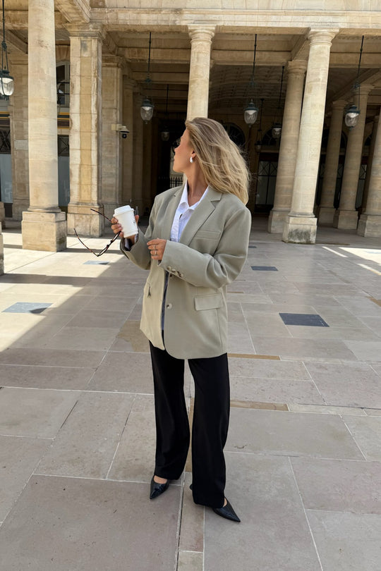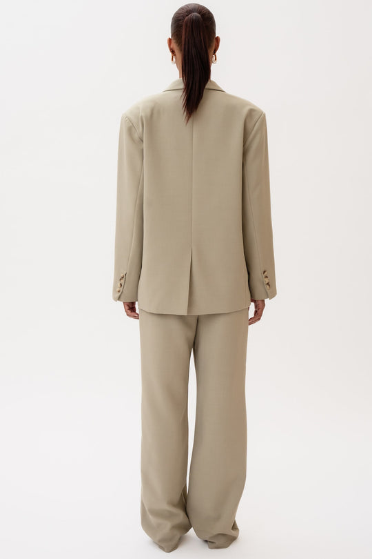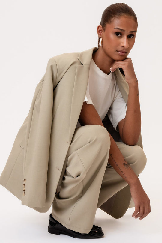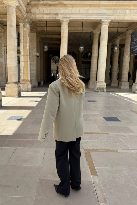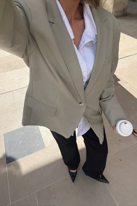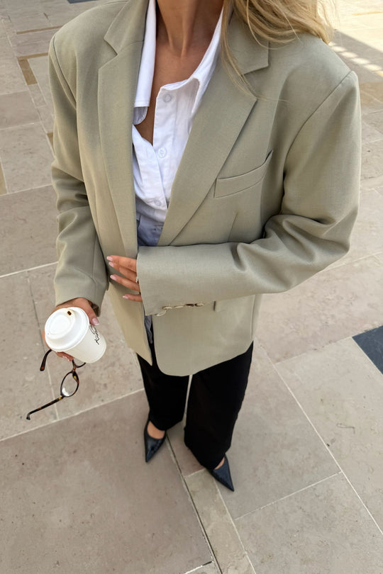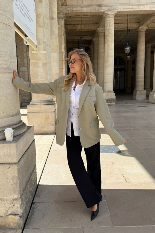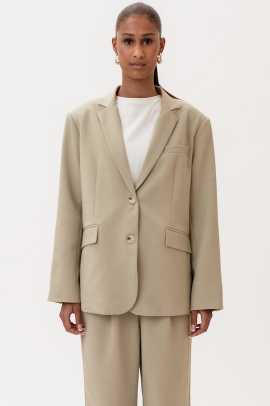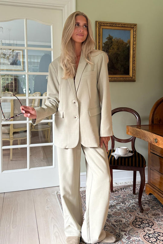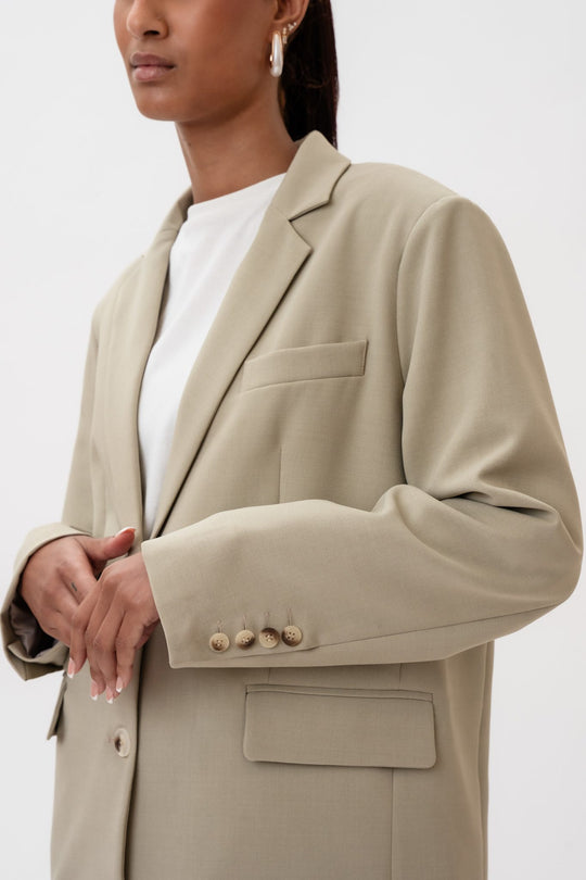 Støvet beige blazer i et smukt stof. Den har en lige pasform og lige ærmer med knapdetaljer ved ærmerne. Der er en lomme på venstre bryst, to forlommer nederst og en skjortekrave, der går i et V foran, hvor to knapper lukkes. En slids bagpå giver et elegant touch til det samlede look.