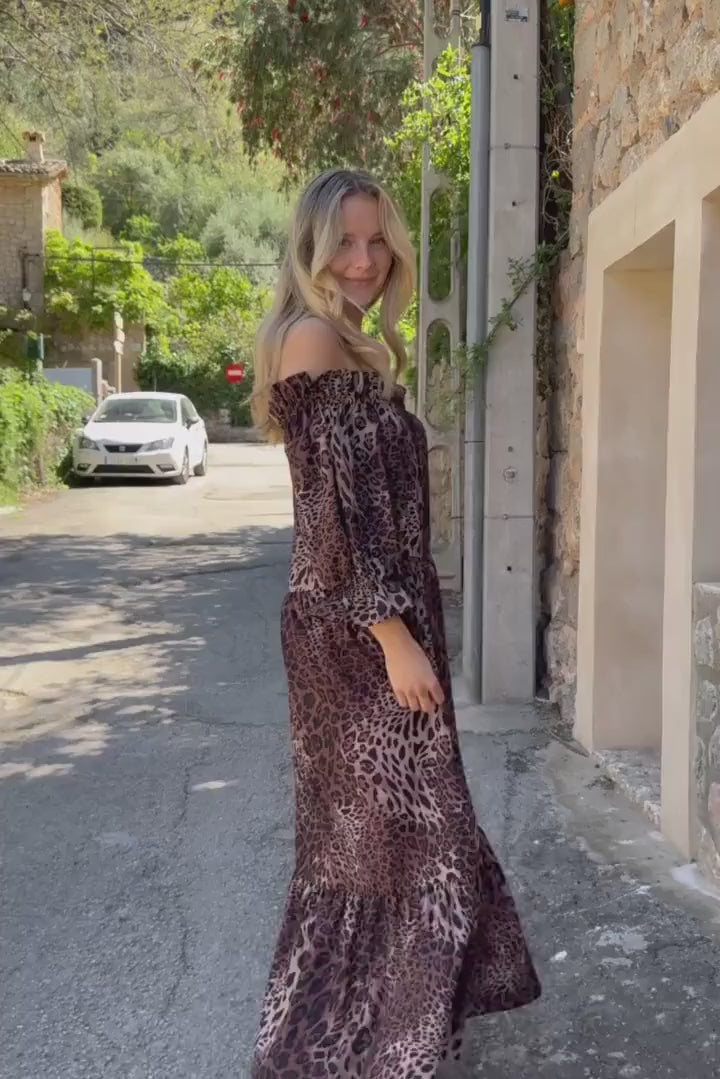 Maxi længde off shoulder kjole i leo print med korte ærmer.