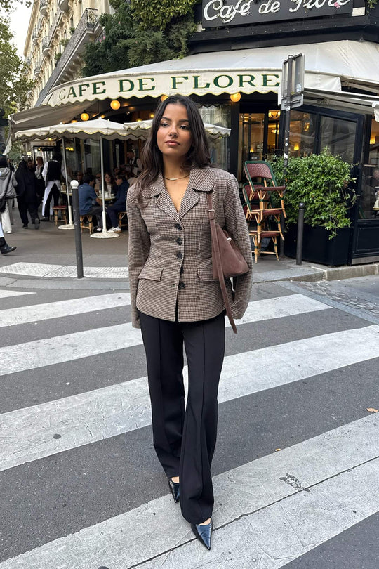 En brunternet blazer i et smukt kraftigt stof. Blazeren er skræddersyet til en flatterende pasform og har lange, lige ærmer. Den har to forlommer og en skjortekrave, der åbner i en V-form foran. Foran lukkes med mørke, naturfarvede knapper. En slids bagpå giver et elegant touch.