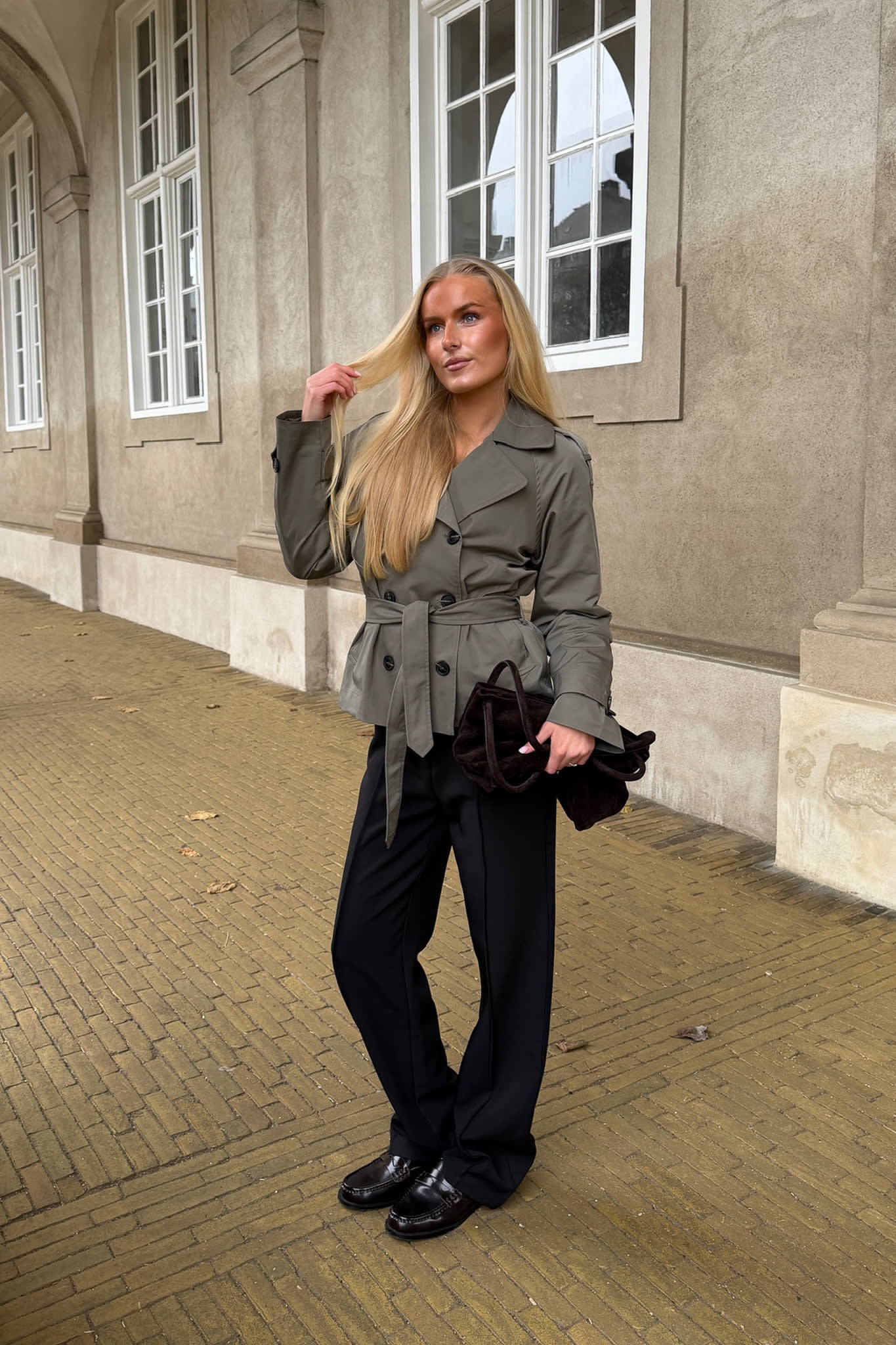 En moderne og elegant kort trenchjakke med en tidløs silhuet. Designet har en dobbeltradet front, bindebælte i taljen og knappede manchetter for et raffineret look. Strukturerede skuldre og rene linjer tilføjer et feminint og sofistikeret touch, mens den korte længde gør den ideel til overgangssæsoner. Fremstillet af et let, glat stof, der holder formen og giver en poleret finish – et alsidigt basisplagg til både hverdag og mere elegante lejligheder.