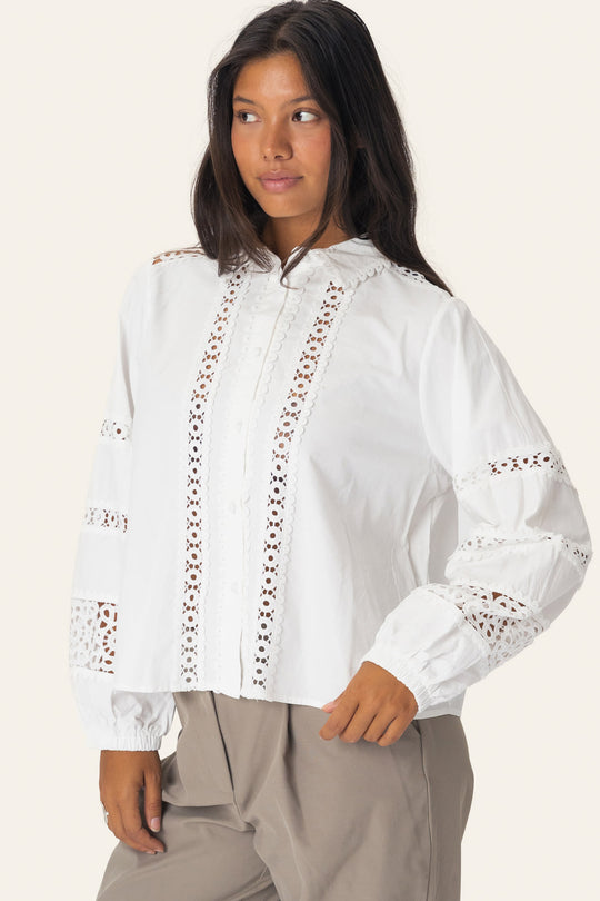 En elegant hvid skjorte med en løs pasform omkring kroppen, der tilbyder en afslappet, men raffineret silhuet. Designet med lange ærmer og elastiske manchetter, der skaber en diskret pufeffekt. Den har en klassisk skjortekrave og fuld knaplukning foran. Fine blondedetaljer pryder både ærmer og krop, hvilket tilføjer et feminint og sofistikeret touch.