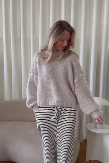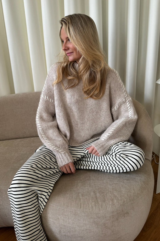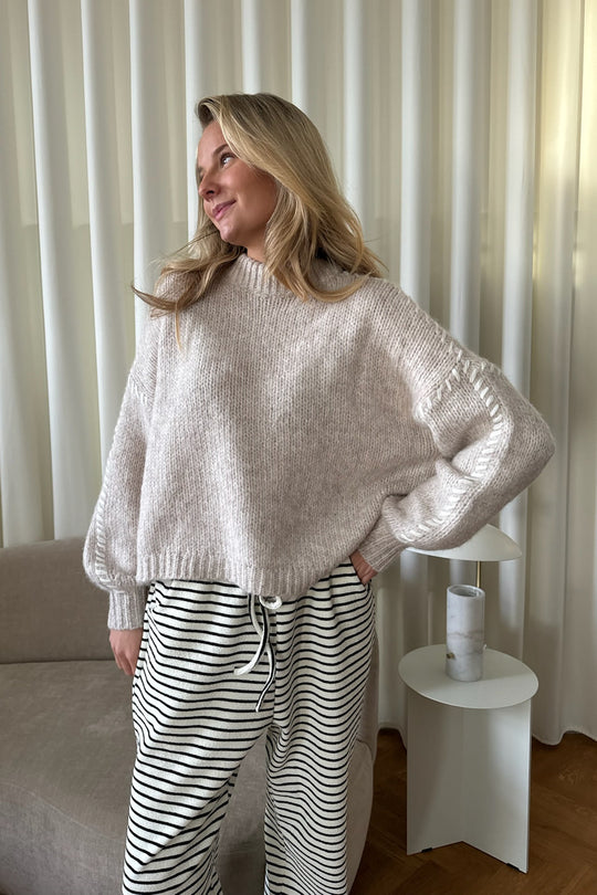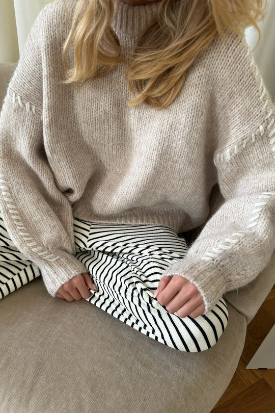 Strikket trøje i beige med hvid syning på ærmerne.
