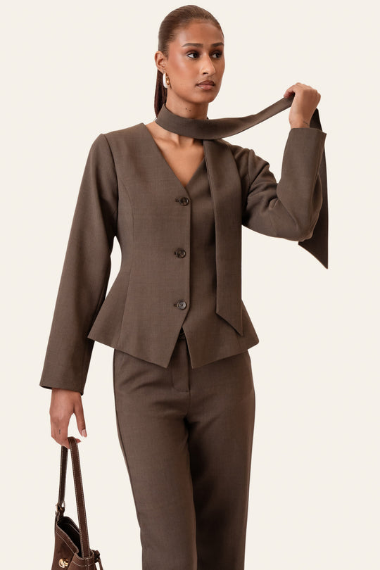 Figursyet blazer i luksuriøs kvalitet. Blazeren lukkes foran med mørkebrune knapper, og sammen med slidsen under lukningen fremhæver dette taljen. Den har skulderpuder, der tilføjer struktur og en raffineret silhuet, samt lange lige ærmer og en V-formet halsudskæring, der giver den et elegant look. Blazeren har et bindebælte, der kan bæres i taljen eller styles som et halstilbehør for et ekstra touch.